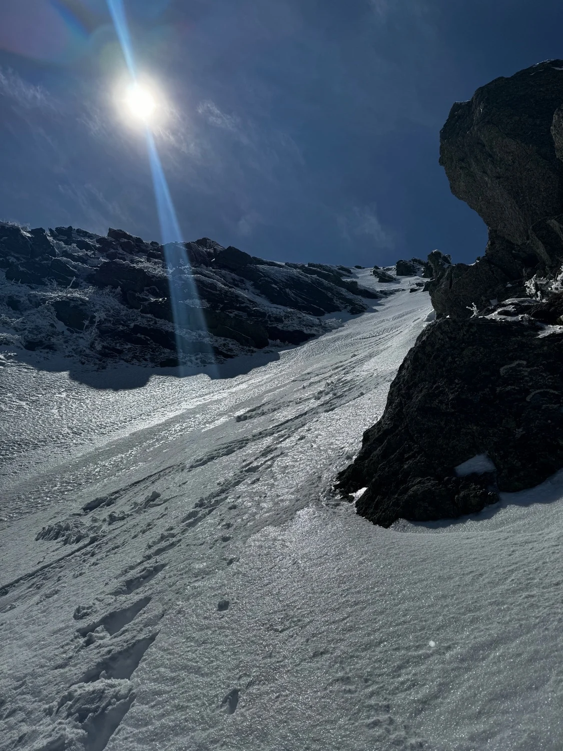 The most technical line in the Great Gulf. Turkey Feather is a variation of Turkey Chute that is closed off by ice bulges at the bottom. A downclimb or rappel is usually necessary, but fat conditions sometimes offer a way to sneak through.
