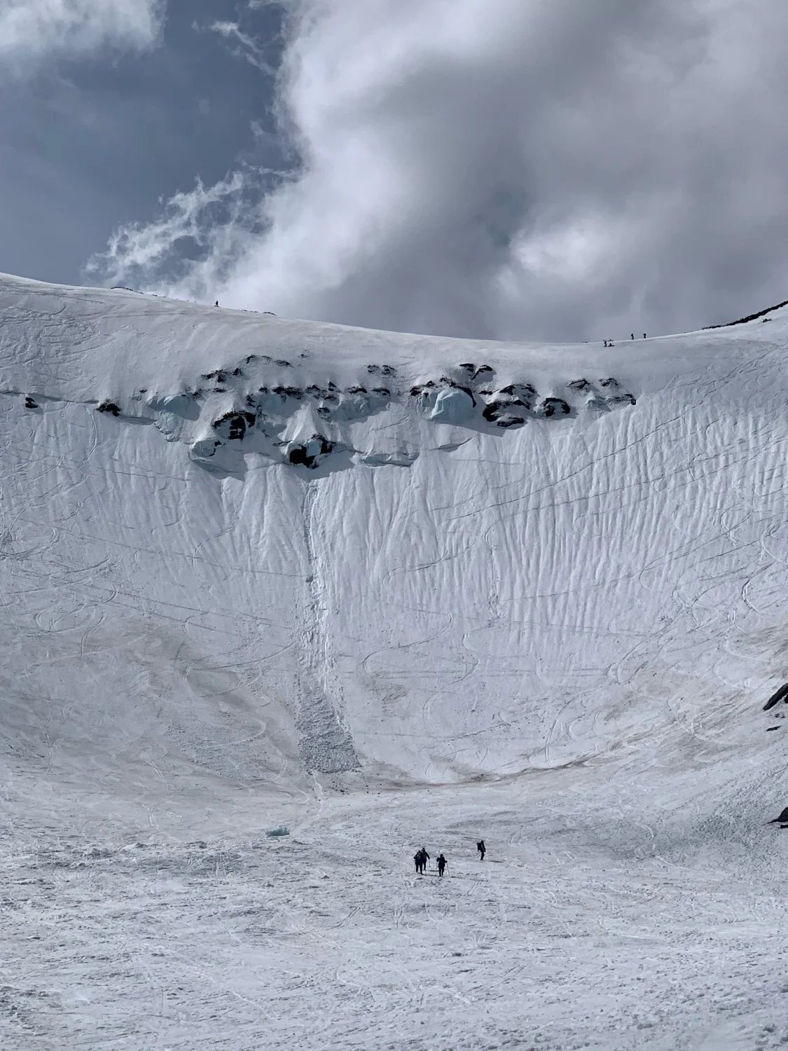 This is the series of ice cliffs located in the center of The Bowl of Tuckerman Ravine. There are a number of lines possible here with airs ranging in various sizes. In high snow years. It’s possible to ski through one chute in the center of the icefall cleanly. Otherwise, it’s air time. A huck of the icefall is likely to get a cheer from the entire Ravine, and in the spring it’s common to see spectacular sends and wipe outs. Beware that in late spring, melt holes open up that you can fall into and become trapped under the snowpack, which has resulted in numerous accidents and some hair raising near misses.