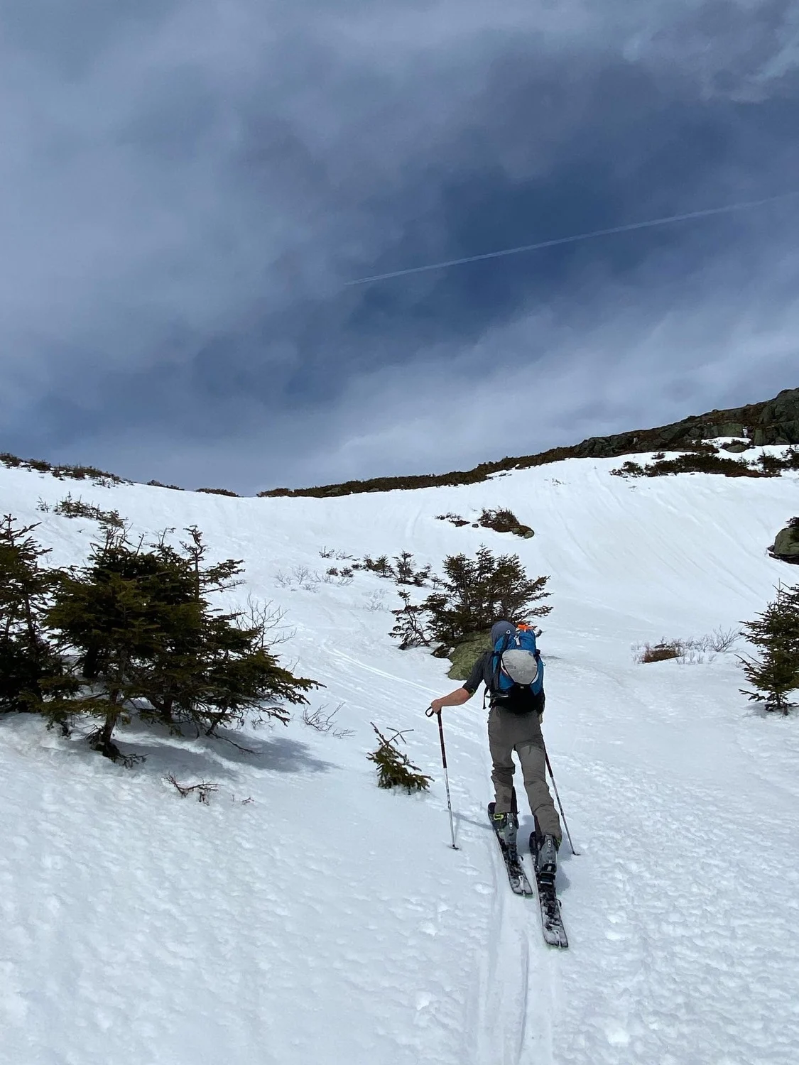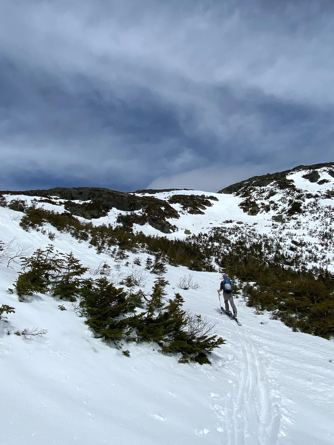 A short run that roughly follows the Dry River Trail. This area has a max pitch of 25 degrees, making it a great option for high danger days, just be aware of your exposure to steeper terrain nearby such as Main Gully and Monroe Snowfields.