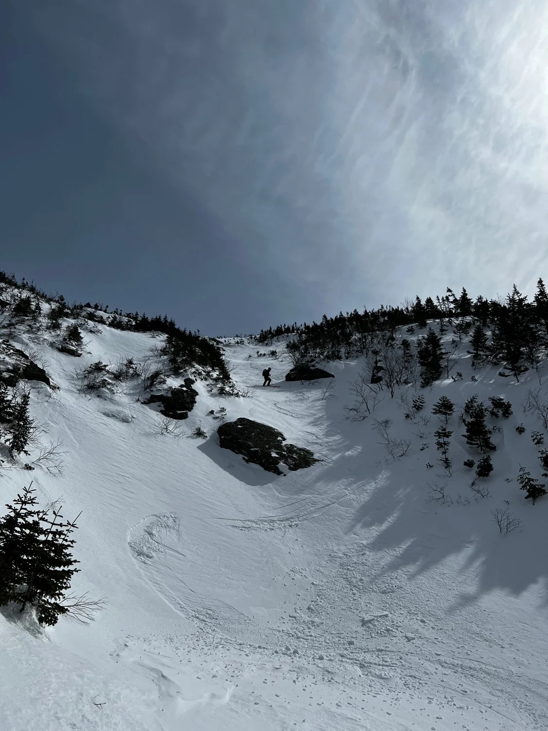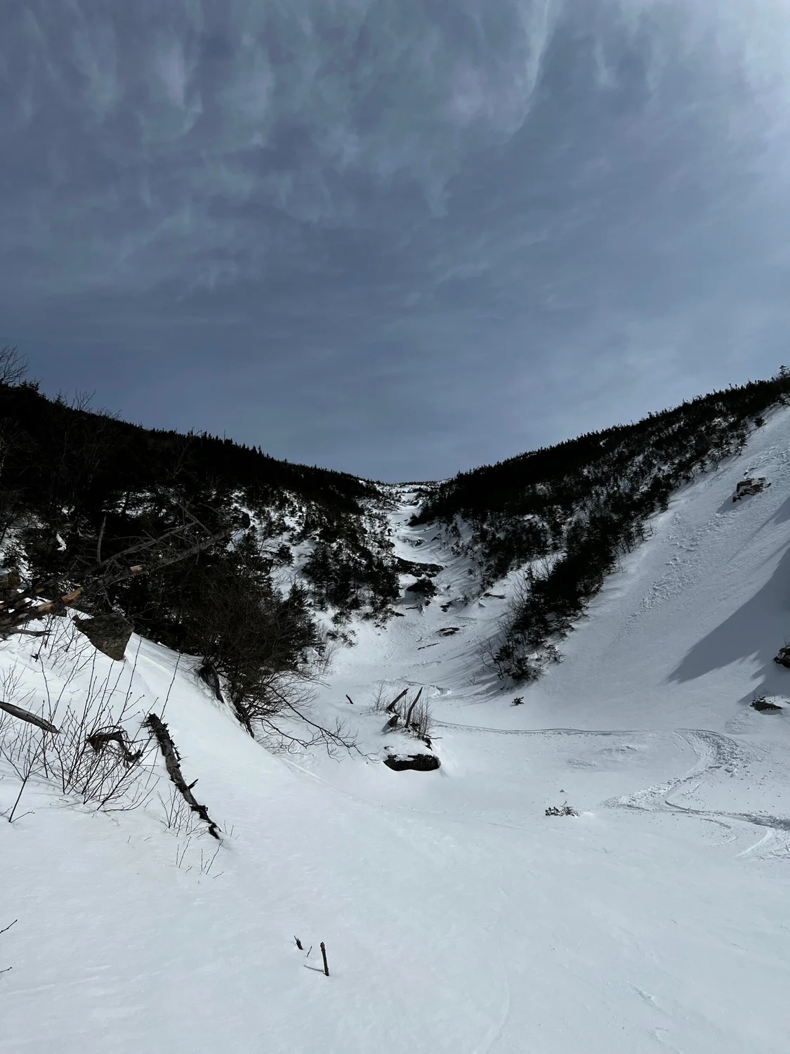 The North Branch of Ammo is a unique line that unfortunately doesn’t always form. NW winds frequently scour this area, preventing a snowpack from developing. The North Branch offers mellow, yet adventurous skiing. Start by skiing up the Cog Railway. Above Jacob’s Ladder, traverse right following the cairned West Side Trail into the heart of the gully. Surprisingly low angle skiing in the upper gully, slowly steepens and funnels into a series of cascades. The lower half consists of tree lined gully skiing with a series of convex rolls. These rolls often present ice bulges that can be traversed around in the trees to either side. Negotiate these little rolls and cruxes until you reach the creek bed below. Ski out to where it joins the South Branch, and follow this back to Ammonoosuc Ravine Trail.