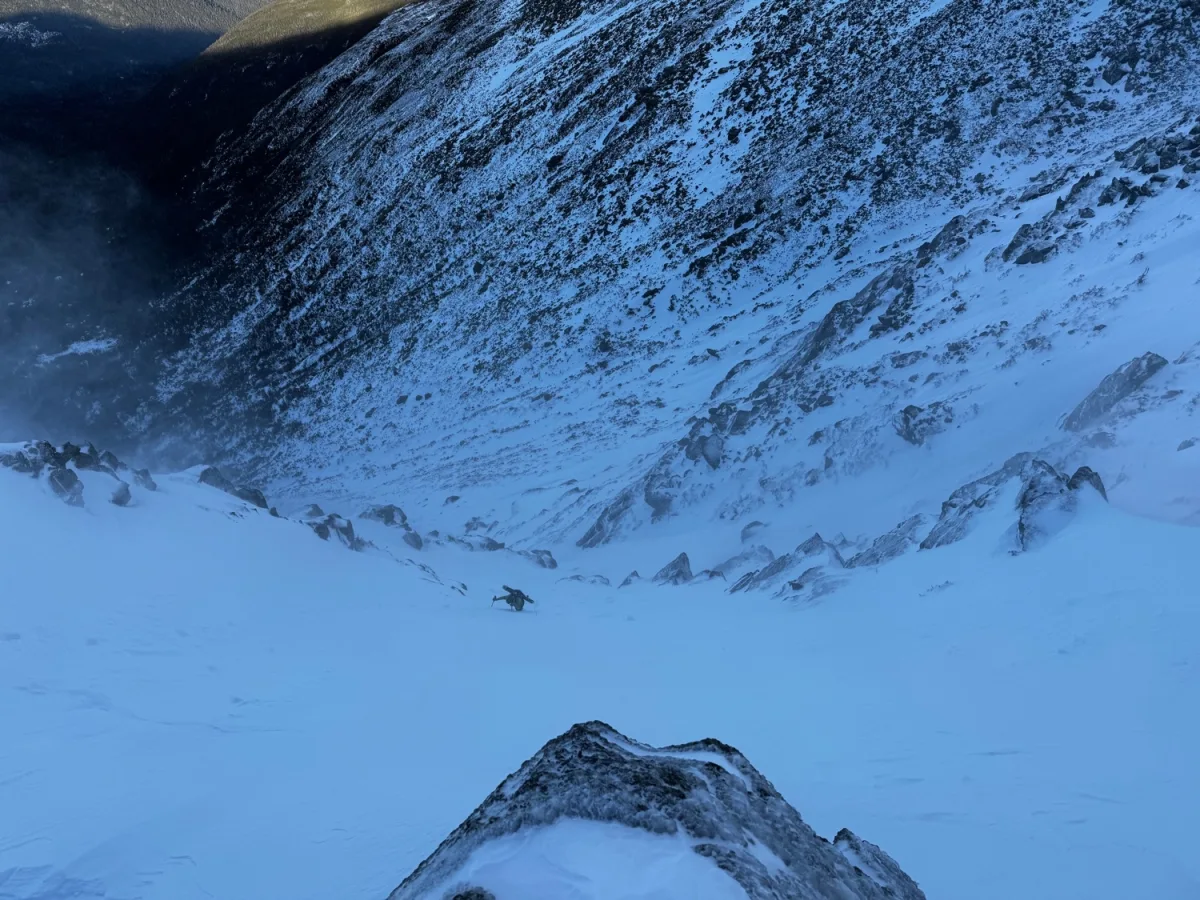 One of the more reliable options in the Great Gulf. Turkey Chute’s northerly aspect usually allows it to last late into the season. Walk uphill to the top of Airplane Gully to the top of a high walled, funnel shaped chute, split by large rocks into the top. Pick your desired entrance and drop in. Steep turns merge the various entrances into the center of a high walled chute. Ski through the gut and out to a snowfield above a boulder field. Due to the rocks beneath this line, a fall in Turkey Chute could be very consequential. Traverse to skiers left and join the runout of Airplane Gully. Ski this to the bottom of Great Gulf and hike out. Usually Airplane has a bootpack in place for an easy exit.