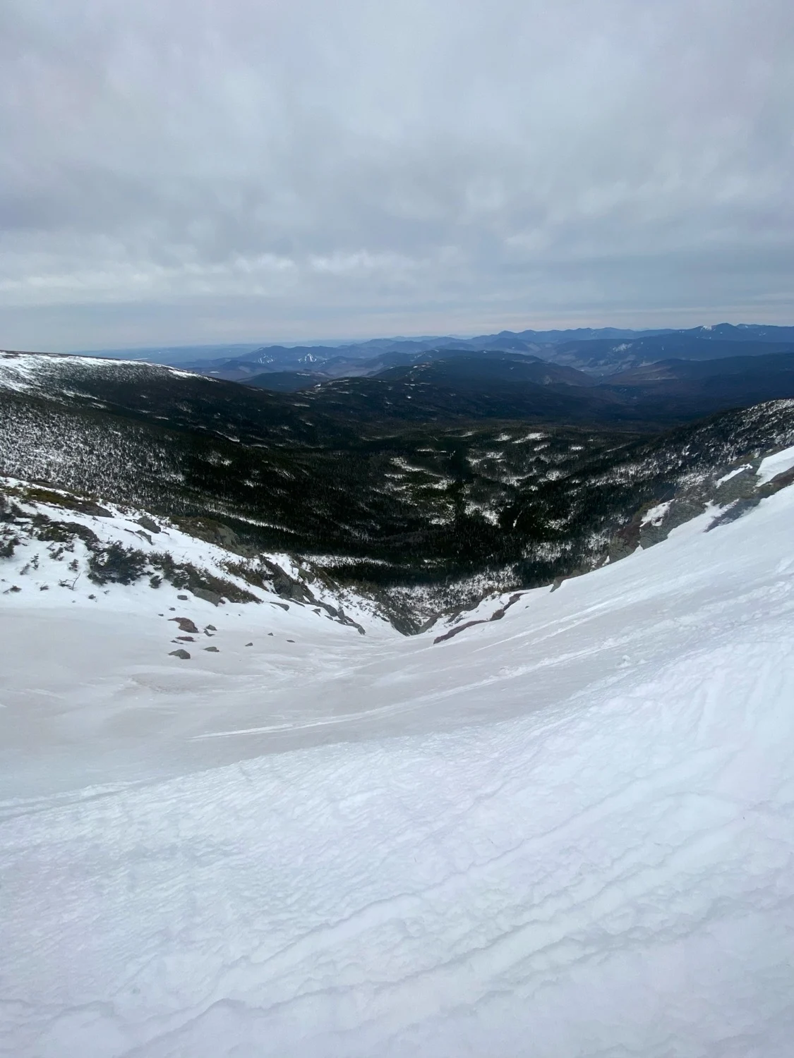 The line is difficult to spot from above, and there is usually a small cornice at the top, so approach the edge cautiously. Drop in and enjoy steep turns in a wide chute. The line empties out into a large slide path with sparse bushes that gets more dense the farther down you go. Stop and boot out when you’ve had enough, or for the full run, ski it all the way to the flats in Dry River Wilderness. From here you can skin climbers left to a steep drainage near the bottom of double barrel. Steep kick turns lead to the bottom of Robinson’s Neighborhood where more mellow skinning gets you back to Lake of the Clouds.