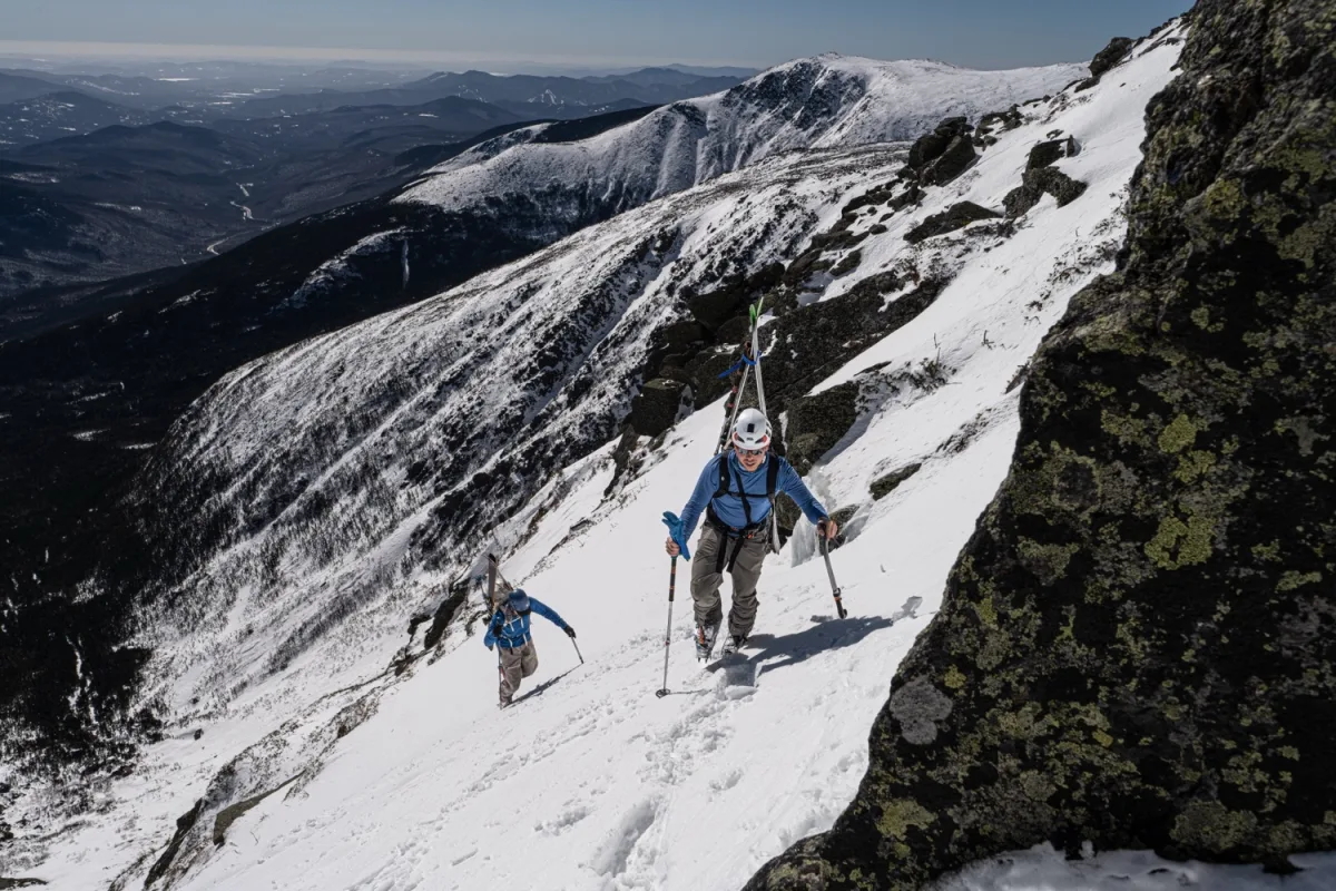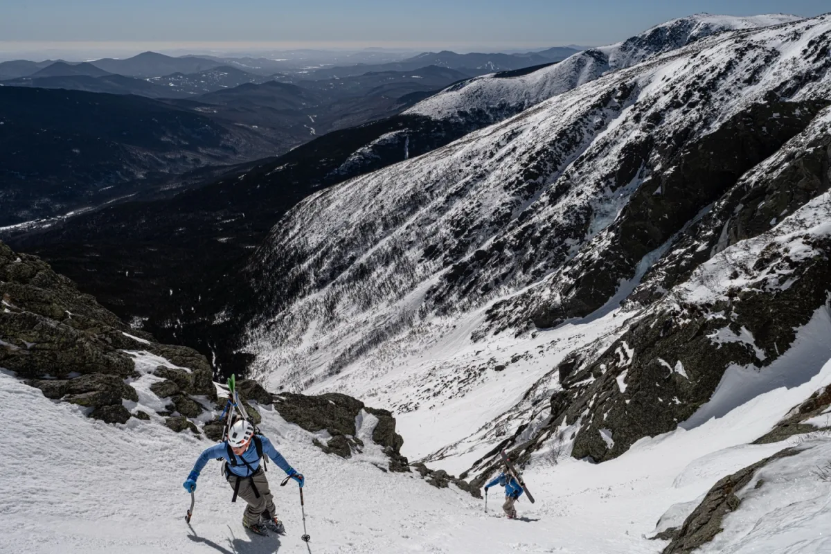 When it’s in, this route is one of the longest and most sustained ski lines in the White Mountains. From below, the amount of blue ice makes this line seem incredibly unlikely from below. However, it’s possible to weave around almost all of these, except for the final bulge at the very top which is rock lined on either side and requires a perfect storm with minimal scouring to set it up. As a result, this would be classic can go entire seasons without being skied.