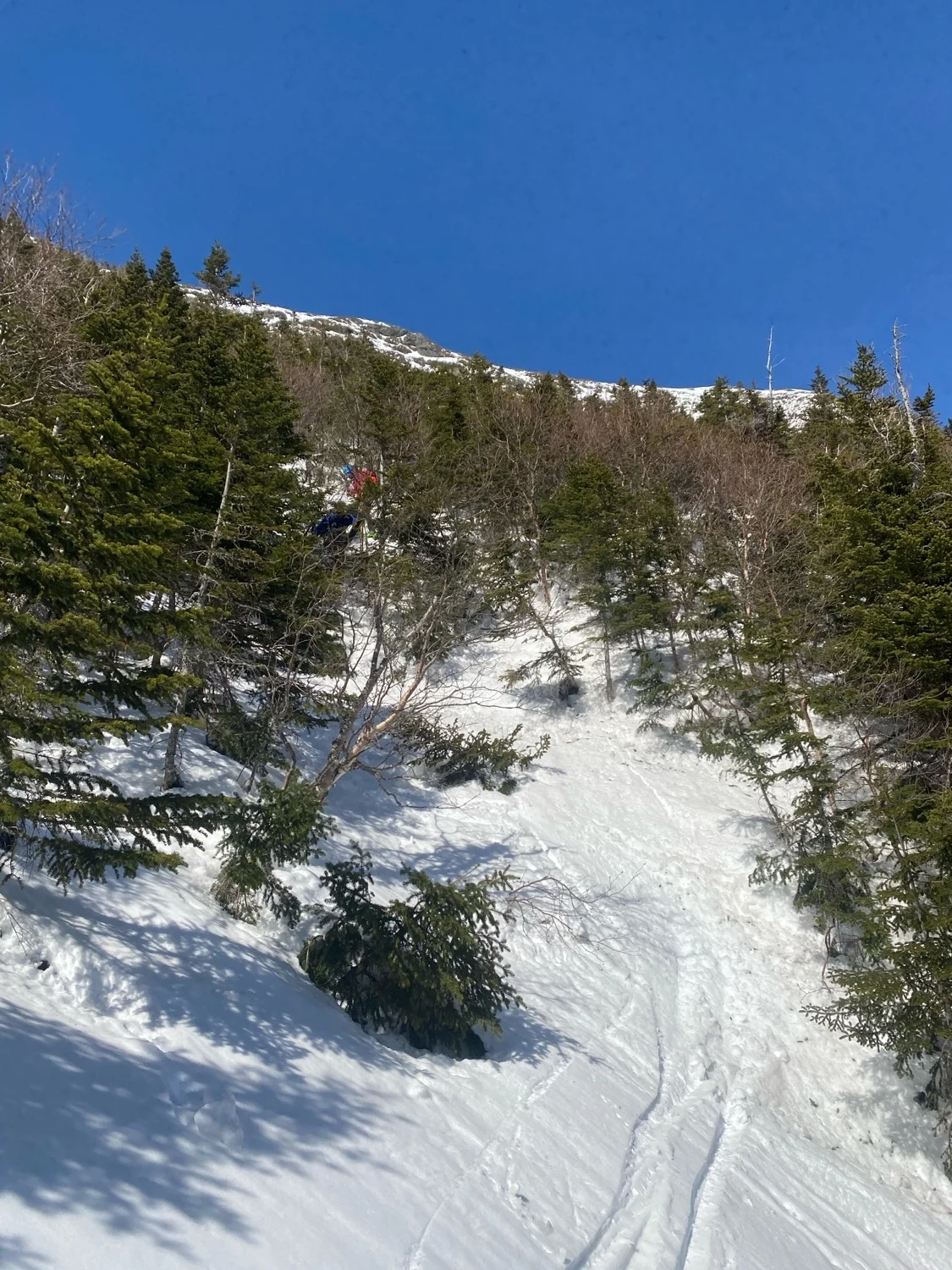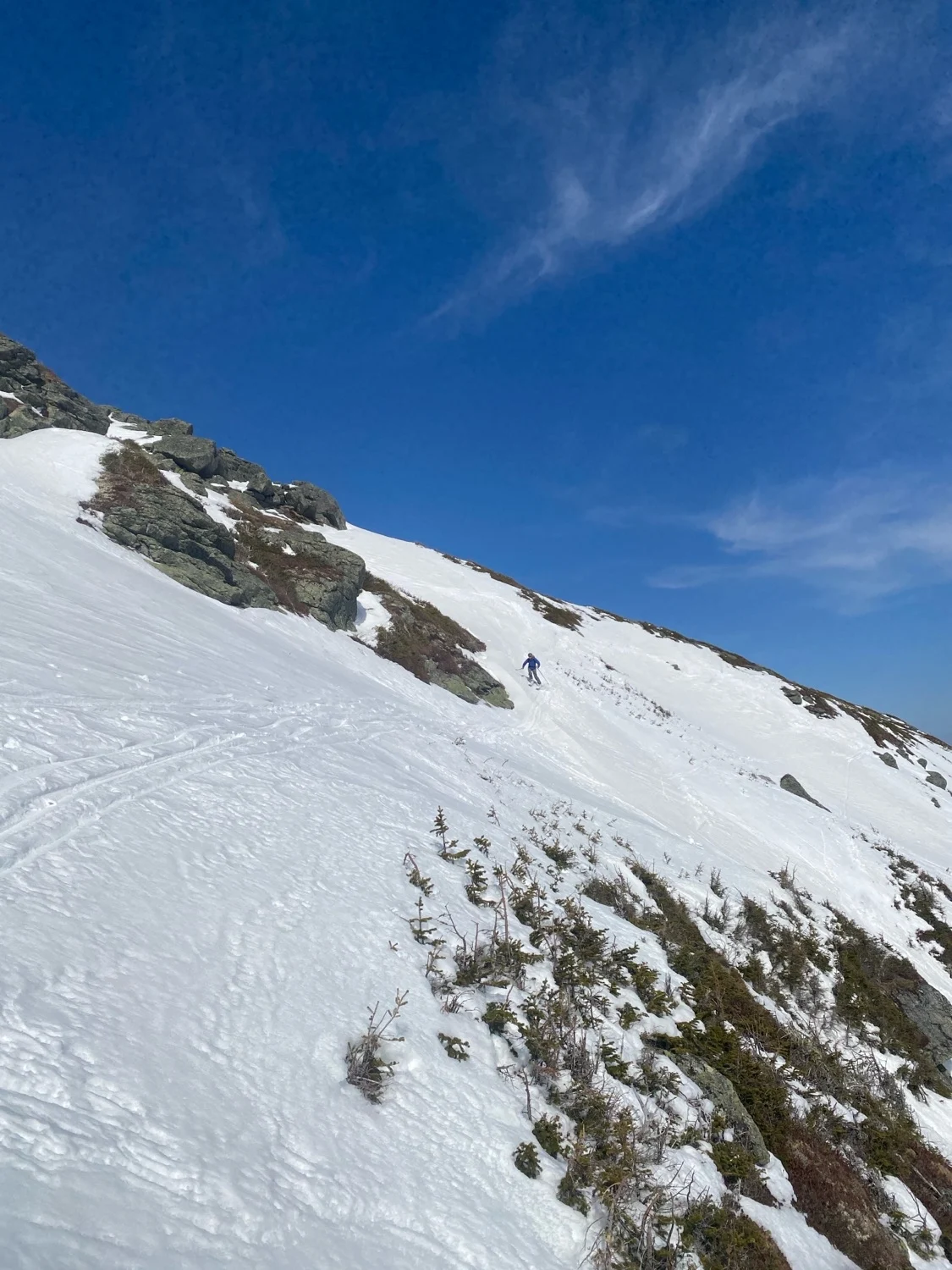Reach the summit of Mount Clay and drop in to the Great Gulf, a short hanging snowfield leads to a left trending ramp. Make turns down this exposed ramp, which empties out into a wide, low angle chute. Ski this all the way to the bottom, until the line is closed off by a small cliff. Bushwack to skiers right and exit the gully, trending towards Spaulding Lake. Skin back towards Spaulding Lake and reconnect with the bottom of Airplane Gully for the exit.
