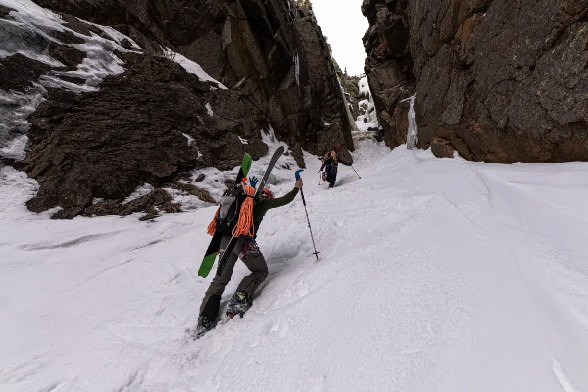 A high walled, aesthetic gem of a line. This route is incredibly ephemeral, which is unfortunate because it’s such a cool ski! Follow the approach from Willey House to Central Couloir, and climb most of the way up, where Central breaks left into the deep couloir, break right into the obvious chasm. This is not particularly steep, and bushes and rocks often obstruct parts of the line, but the setting makes up for it. Bootpack to the base of the ice climbing, and dig out a spot for your skis here. Drop in and enjoy tight turns in this wild chasm. A small chockstone sometimes requires removing the skis for. Ski out of the rock walls and either traverse right to join Central, or milk the independent line further down into the trees to join Central lower. Ski out the bottom of Central and retrace your steps to Willey House.
