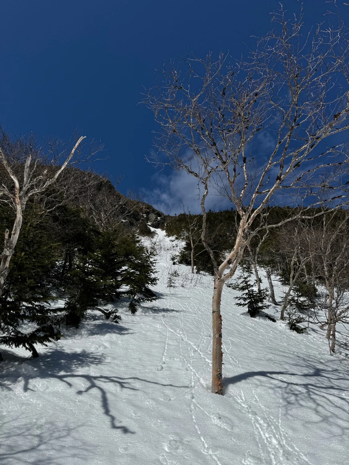Milk the tree skiing for as long as you want and put skins on. Rather than do the bushwacking portion of this line as an uphill battle, it’s much better to skin back towards Bifocal Gully. Some easy skinning with a little light bushwhacking leads to a clearing beneath Bifocal Gully.