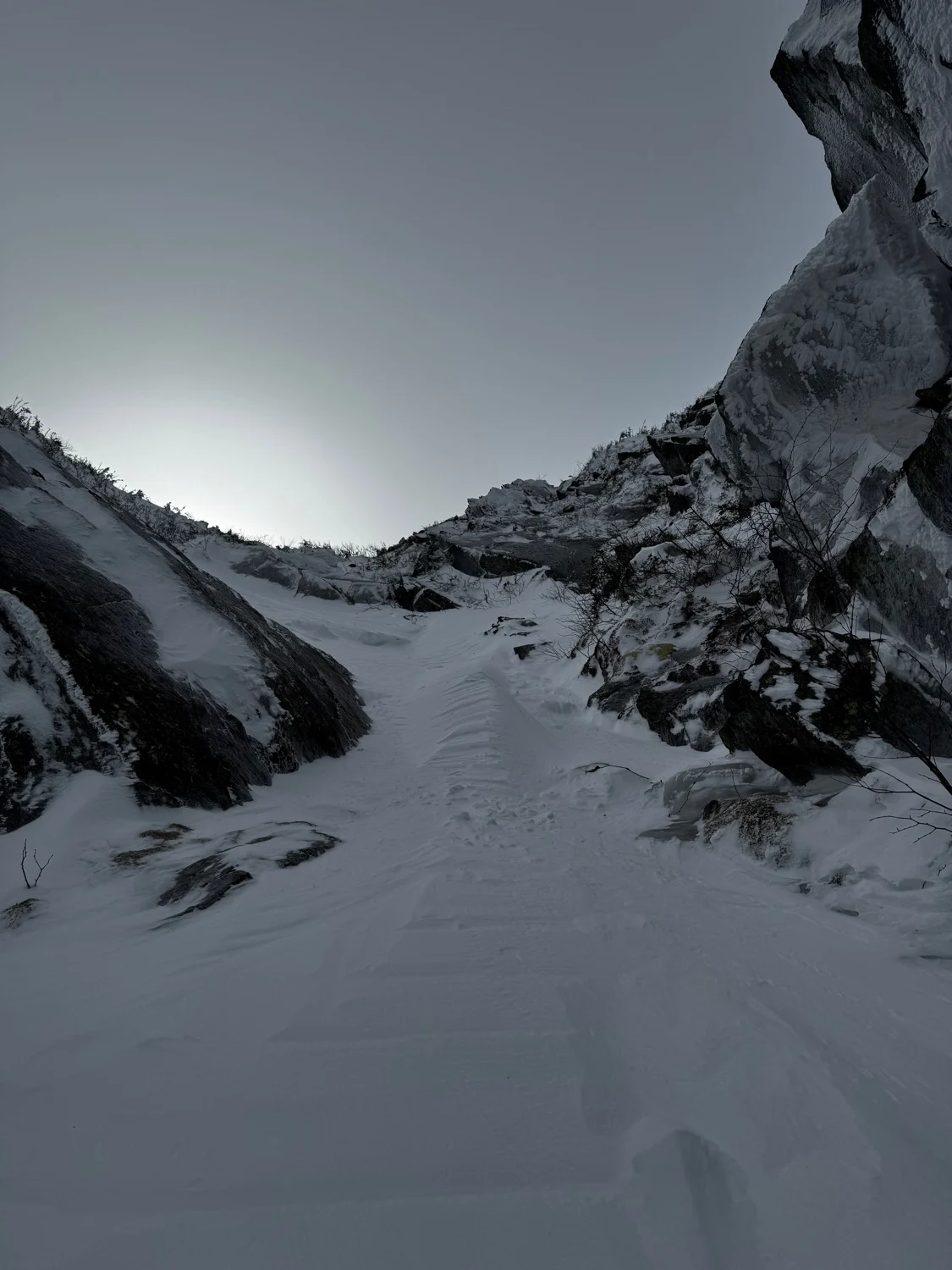 The most condition dependent of the 3 Sisters, but one of the best when it’s in. The middle of this line is often squeezed off by a rock band/ice bulge. The top of the line begins with a narrow gully, this leads to the top of the rock band.