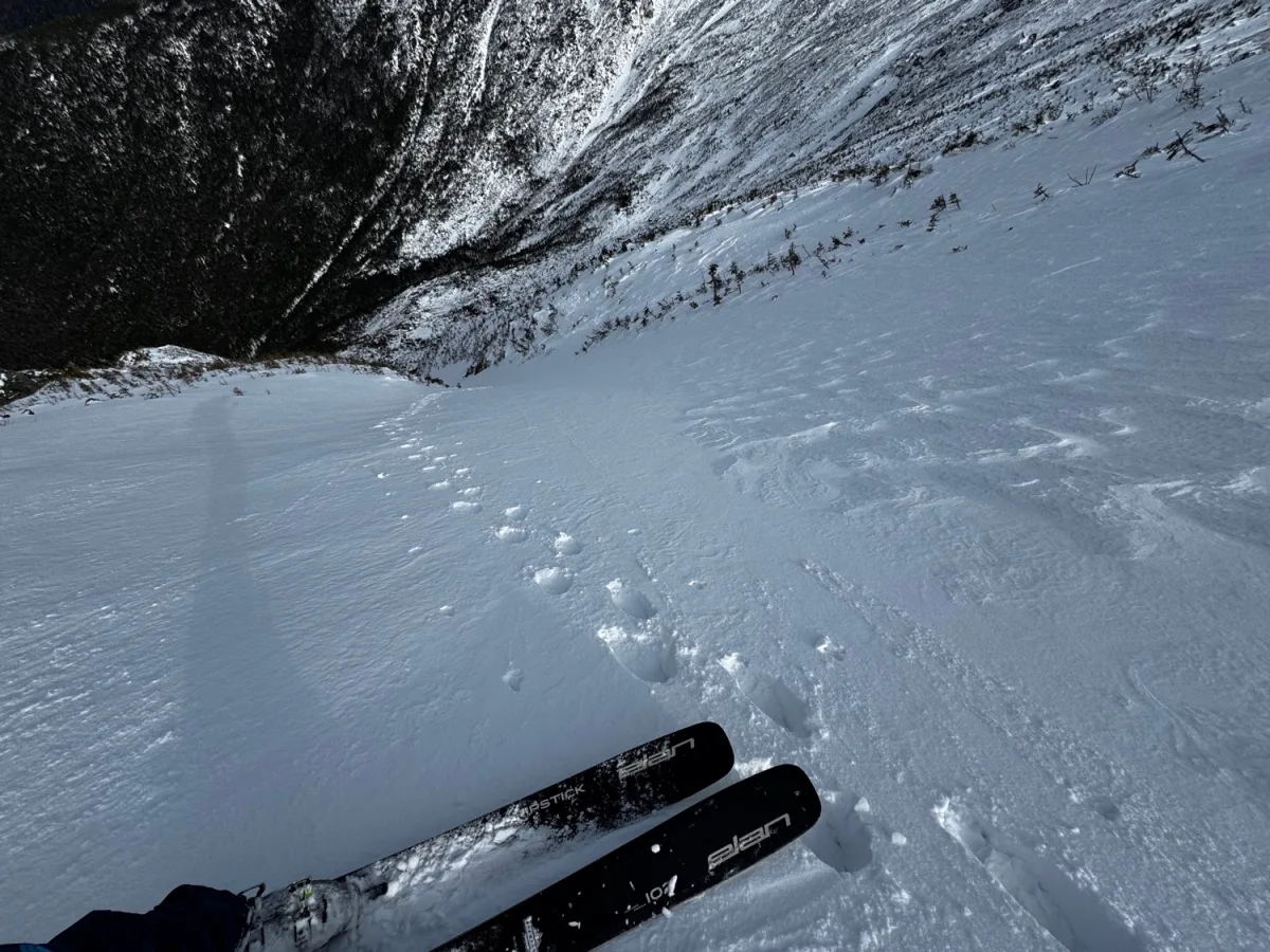 Skirt this through a narrow choke to skiers left, then join a steep runout. Ski the shared exit the others sisters to the bottom and bootpack out.