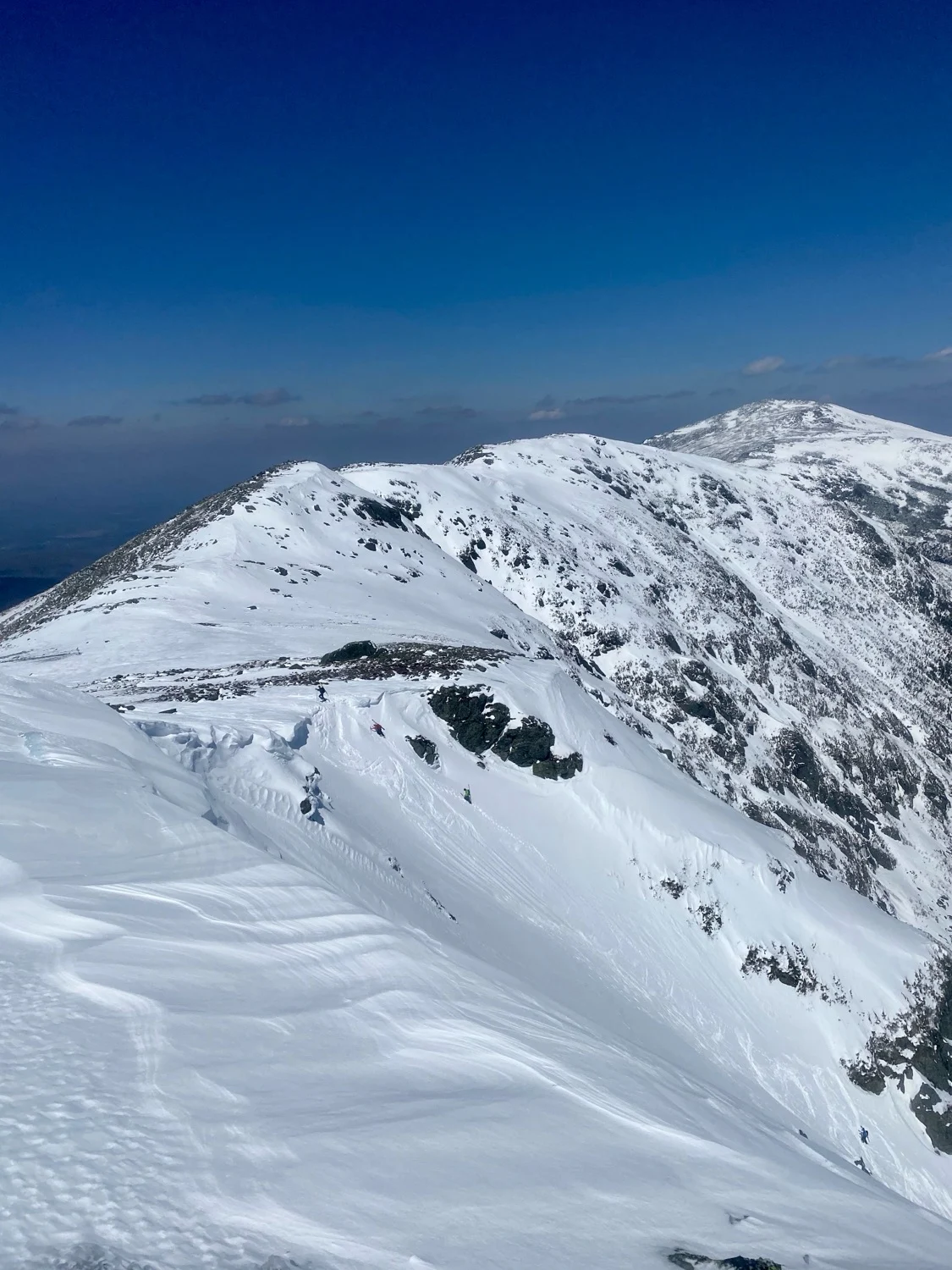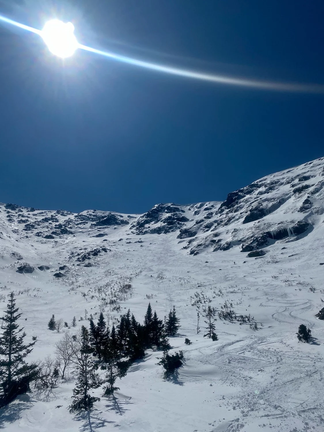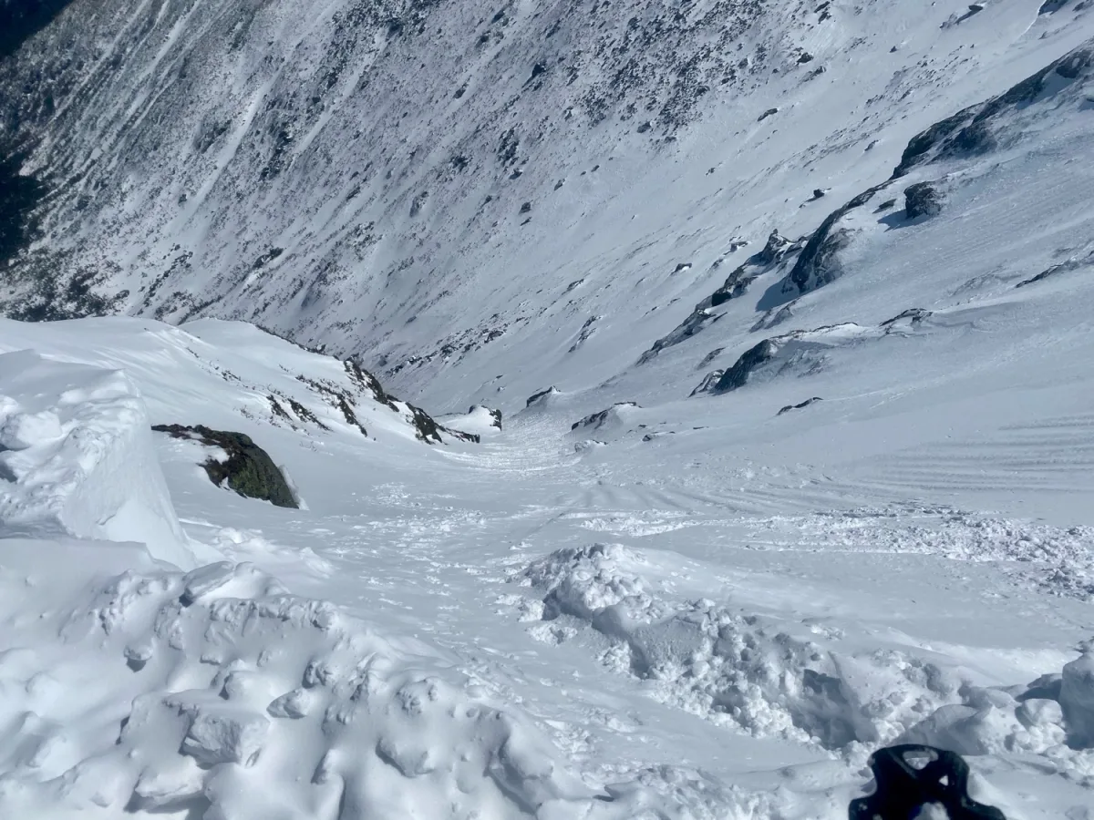 Skin The Cog to just above Jacob’s ladder and break left to the ridge. Airplane Gully has a number of variations, but the skiers left entrances is the widest and easiest entrance. A cornice can often guard the top. Drop in and ski 40 degree turns to a constriction. Exit the rock walls into a long runout. This gets skinnier as you descend and gradually decreases in angle until you are just above Spaulding Lake. Your best exit is to bootpack by out Airplane and ski down the Cog.