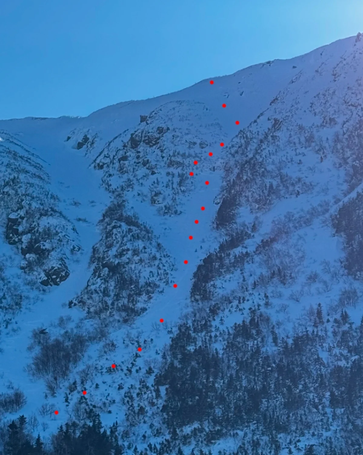 When the lower portion of Great Gully is closed off by blue ice bulges or running water in late spring, it’s common to traverse into a lookers right (skiers left) variation to skirt around it. However, this variation can also be skied top to bottom, which makes a great objective within itself. I haven’t found a name for this so I’ve simply given it one. Either climb it from the bottom of traverse over to skiers left from the top of Great Gully. Steep turns in a funnel shaped chute bring you to the top of a 20 foot cliff, this can be avoided to skiers left or right through the bushes. Rejoin the gully and follow more mellow turns down the open finish. Due to the cliff in the middle, this line is a no fall zone and should be approached with a high degree of caution. A fall or avalanche will have serious consequences.