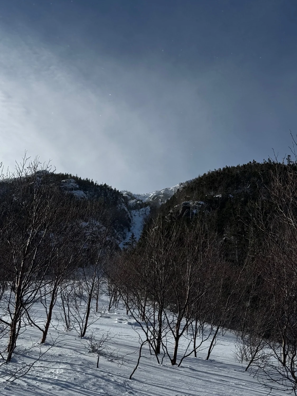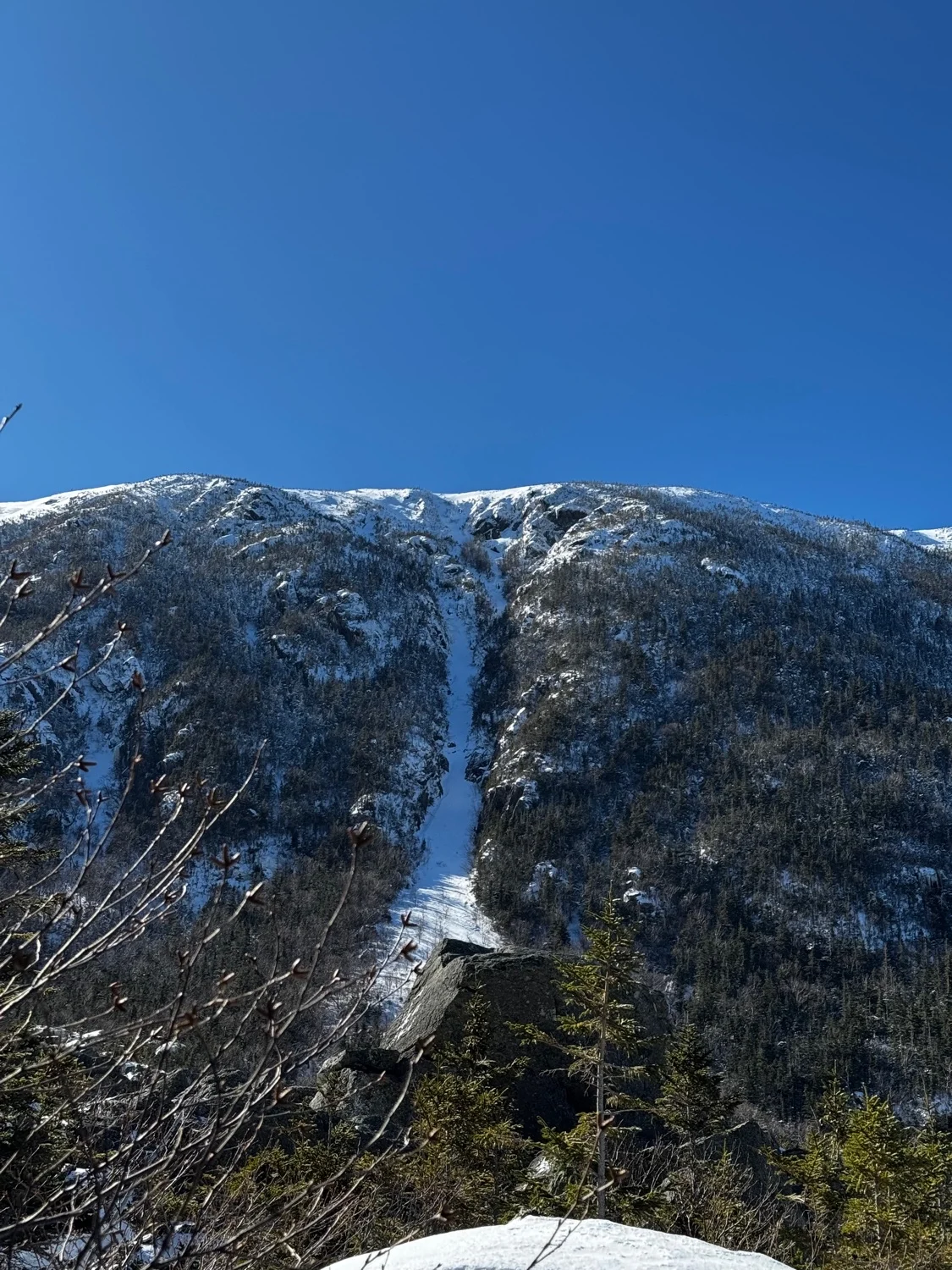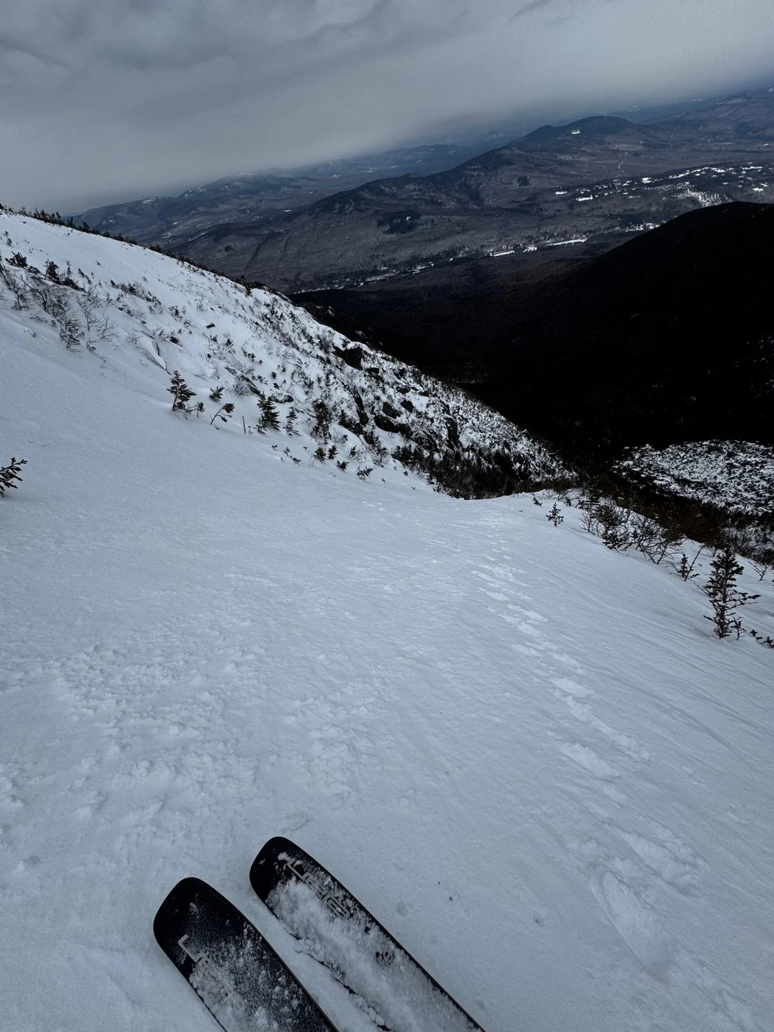 Skin the King Ravine trail to where it wraps around a large boulder to the left side, revealing an incredible view of the line. From here, remove skis and bushwhack to the boulder field. Take the path of least resistance through the large stones, this is challenging but not as bad as it looks on paper. Bushwhack through shrubbery to the base of the line. From here begin boot packing up. At the bottom you’ll encounter a choke point, for us this was a mere commitment turn, but in most years it’s a pitch of WI3. Negotiate this to reach the inside of a deep couloir. About half way up it splits into two, the left is sealed off by a large ice slab, the right is clean and features a narrow dog leg. Ascend to skiers right, passing another ice bulge that squeezes the line to a choke point. Top out the line and put skis on in a comfortable spot. The initial gully begins low angle, before quickly steepening to around 40 degrees, with a wicked double fall line in a narrow chute. Ski carefully above the ice section, being mindful that ice could be shallowly buried under the snow.