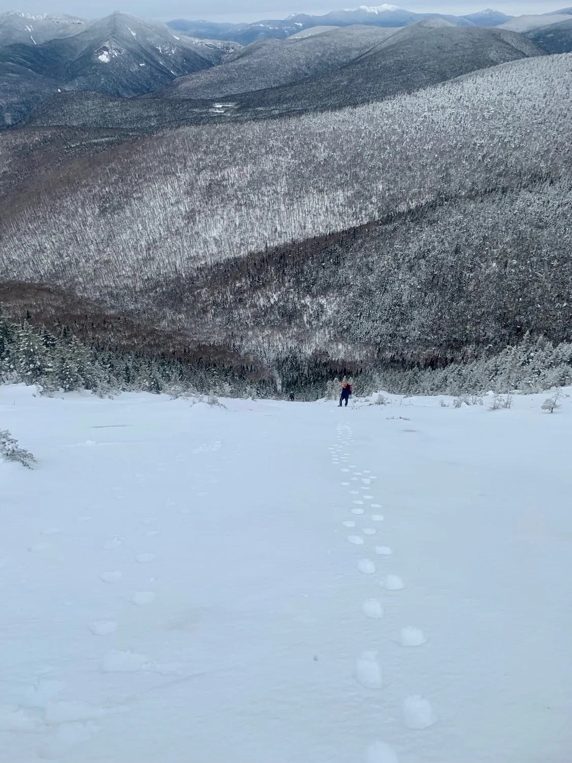 Be aware that this slide, like most in the White Mountains, is a textbook terrain trap with is funnel shape and terminus in the trees.