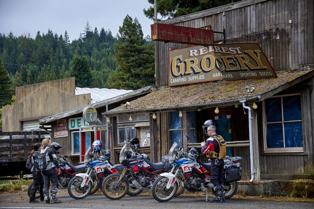 FERNDALE TO FORT BRAGG – 152 MILES As you pass through the “X” of this route in Rio Dell/Scotia, fuel up before Shively Road, a narrow paved road through the woods. Be aware, the bridge over Eel River is seasonally closed between late October and mid-June each year. After Shively you’ll meander through the giant redwoods along the Avenue of the Giants before beginning Dyerville Loop Road. This next stretch features a collection of twisty paved and dirt roads. Be sure to stop and visit the Richardson Creative Exhibit, an outdoor art display on private property open to respectful visitors. Please don’t go past the Bigfoot sculpture—beyond it is the artist’s private home. The route carries on, twisting and turning with impressive views as you reach the New Harris General Store. With food, drinks, gas, and supplies, this is a place you don’t want to miss. In a few more miles you can grab a snack at the honor-system farm stand before reaching Highway 101. Be sure to fuel up as you pass through Laytonville. Fort Bragg–Sherwood Road provides a spectacular finish to this route, beginning with flowy gravel before narrowing into a rugged, overgrown stretch where corners disappear into the brush. Ride Right—oncoming traffic is possible. Though not especially technical, the road is seasonally closed, impassable when wet, and may have ruts or rocks depending on maintenance. Note: The Fort Bragg-Sherwood Road is typically closed to traffic from November to May due to wet conditions that make the unpaved sections muddy and impassable. Check the County of Medocino’s Department of Transportation website for road closures and delays.