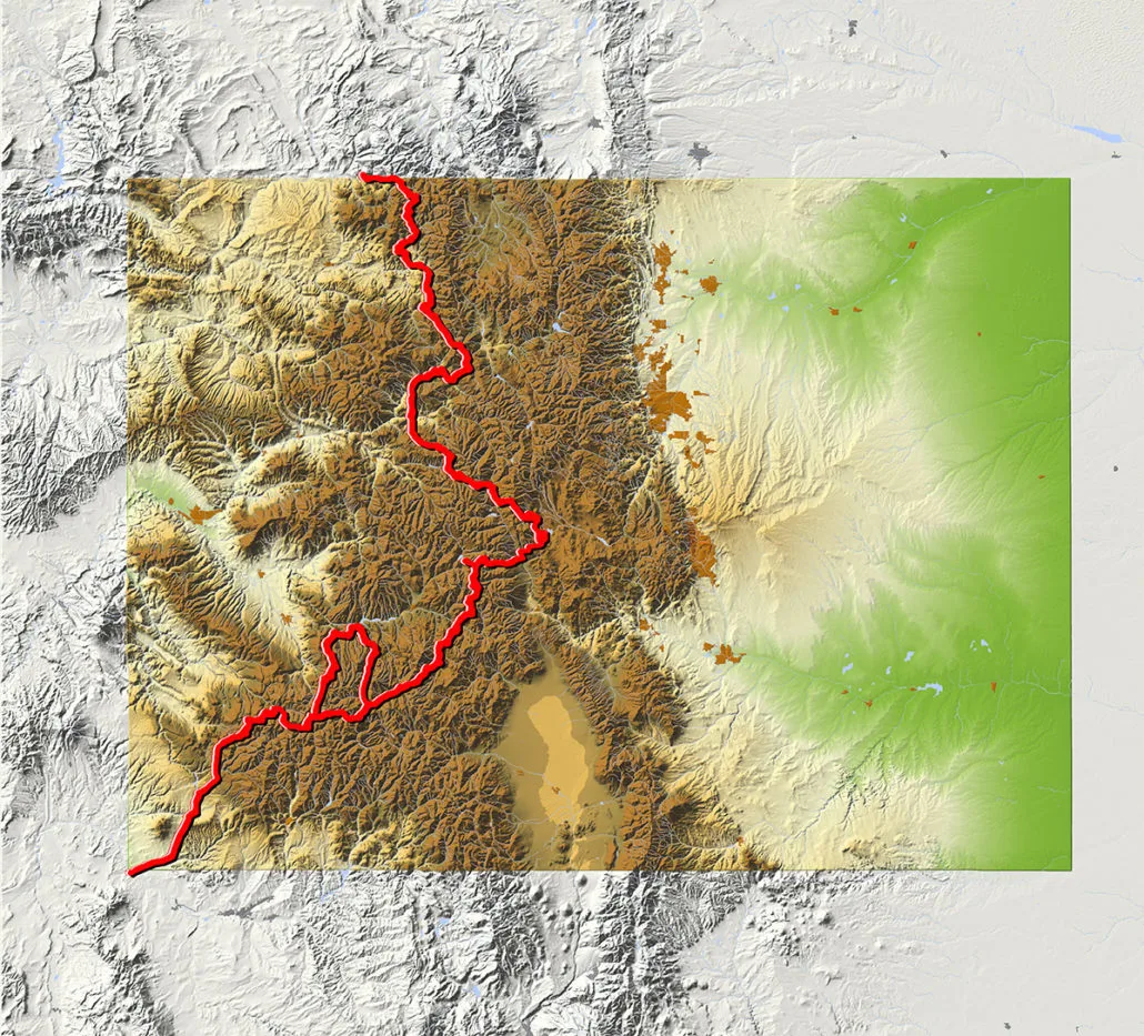 Beginning in the four corners location where, CO, AZ, NM and UT intersect, this 745-mile route winds its way north through the Rocky Mountains to the Wyoming border. The terrain includes dirt roads with rocks, sand and even a few water crossings to keep it exciting.