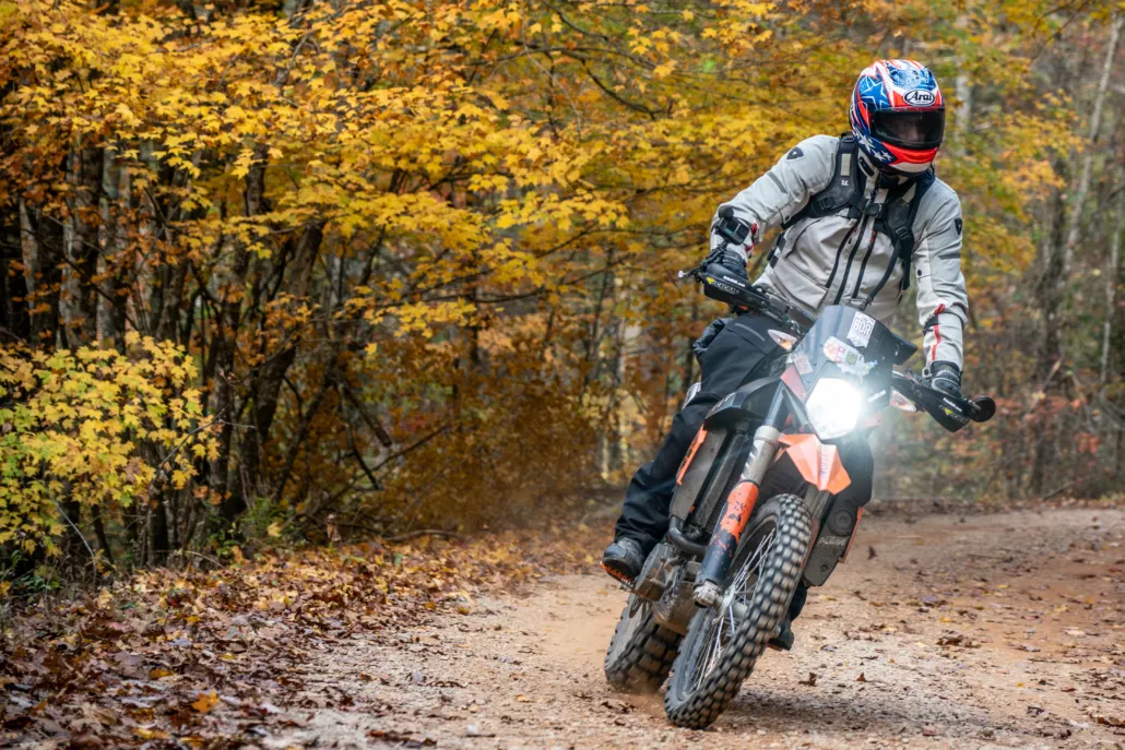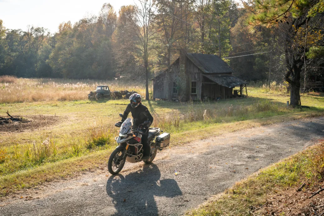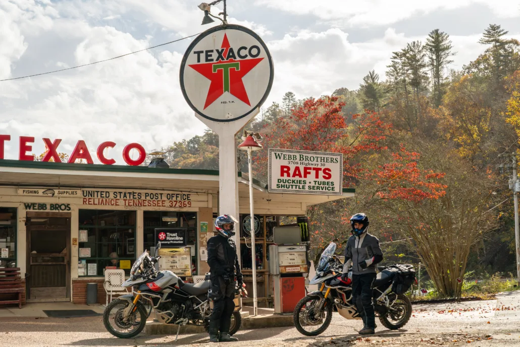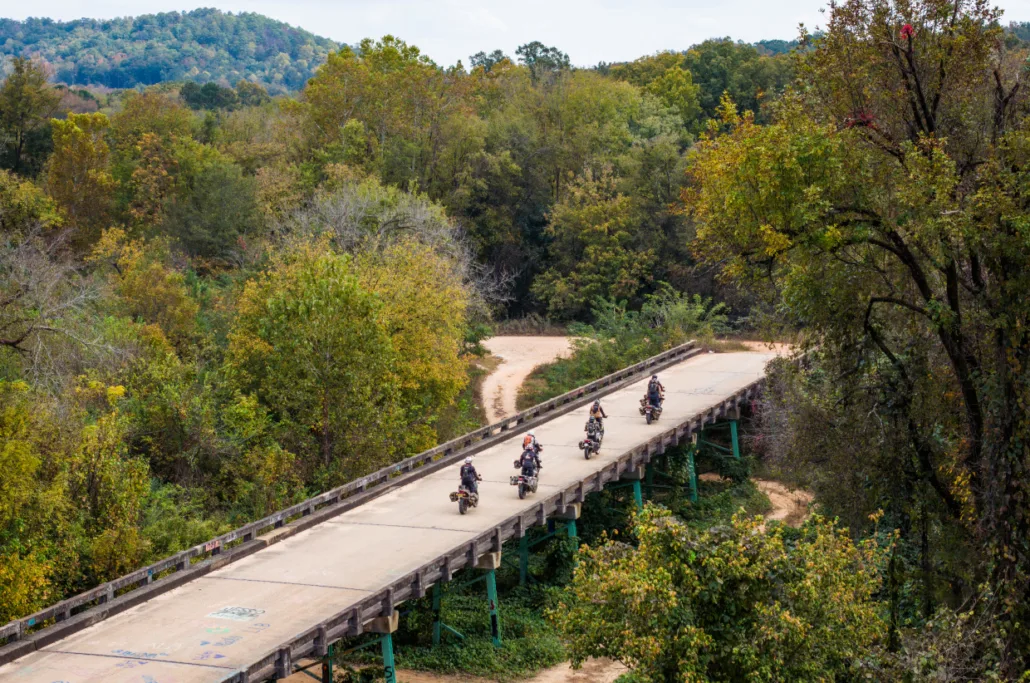 Ellijay GA to Tellico Plains TN – 126 miles Depart Ellijay with a full tank of gas as you reenter Chattahoochee National Forest and then Cohutta Wilderness. Note that portions of this and other sections are typically gated closed from January to mid-March. Scenic overlooks offer fantastic mountain views as riders climb above 3,000 feet approaching the Tennessee border in the forest. Tumbling Creek Road in Tennessee is rocky and steep, providing a moderate challenge as the track approaches the Ocoee River at TVA Powerhouse #3. Follow the contours of the raging Ocoee River along Hwy 64 before heading north on Oswald Road, featuring several spectacular overlooks. Webb Brothers store (typically closed from November through February) is a unique and historic stopover on a short detour with fuel and supplies. McFarland Road is a prime example of dense Tennessee forest riding and offers two interesting extension options: The historic small hydroelectric Apalachia Powerhouse and the ruins of an old cement plant constructed in the 1940s to help build the pipeline viaduct to the powerhouse. At 2,348 feet, Buck Bald is an easy gravel ride and offers a panoramic view of the surrounding mountains as you head north along the foothills of the Smoky Mountains. Witt Road is an alternate harder option offering multiple river crossings, some of which can be quite challenging due to the depth of the water and tricky embedded rock features. If you get your feet wet on Witt Road, the section ends shortly thereafter in the small, outdoor-oriented community of Tellico Plains, TN.