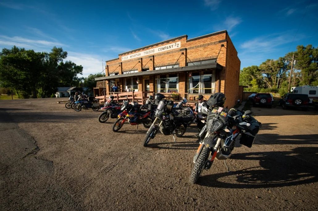CENTENNIAL TO ELK MOUNTAIN – 68 miles After leaving Centennial, riders will begin ascending into the Snowy Mountains area of Medicine Bow – Routt National Forest. The first part follows paved twisties on Barber Lake Road through Libby Creek Recreation Area before returning to the highway. After a couple miles of pavement on Highway 130, watch for a right turn which soon becomes Towner Lake Road, a rugged scenic track below the Snowy Mountains. Look for moose which frequent the small lakes along this road. You’ll find campgrounds galore in this area north of the highway. The brief dirt thoroughfare connects back to pavement and heads westward on Highway 130. You should stop at one of the two signed viewpoints along this section to photograph the mountains. As Highway 130 descends you’ll have to decide again whether to take an harder section. This one involves a deep water crossing and rugged roads for eight miles. Early in the riding season this creek crossing might be too deep and fast flowing to attempt. If so, just take the main route. Soon a 6.5 mile long side trip leads up to the summit of Kennaday Peak (elev. 10,810 ft). Early in the year snow will linger and after the first snows of fall appear this summit might not be attainable. At other times, it’s worth the extra time as the riding is top notch and the views at the summit are rewarding. The rest of this section heads north through typical forest roads before the skies open again to treeless farmlands and wide fast roads leading to the town of Elk Mountain (pop. 194). We recommend filling up at the gas station where the track crosses Interstate 80 as it has high octane fuel and the one in Medicine Bow does not.