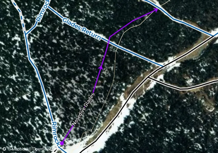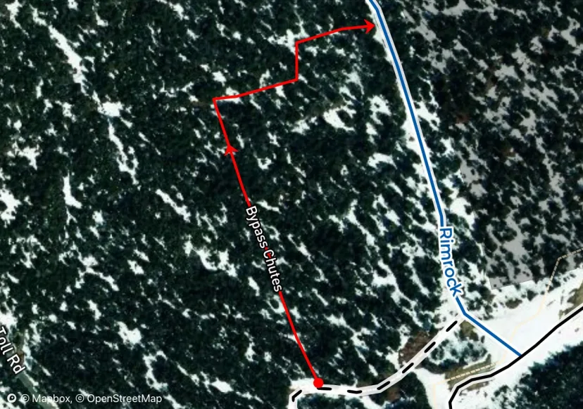 From the top of Perry Merril, just before the first turn, look for a traverse to skiers right. Stay high above the travel and follow this traverse past a couple steep turns, come around the corner to a prominent cliff band. Ski along the base of the cliff, enjoying this cool perspective of the mountain. While early drop ins are tempting, for the widest glades, continue all the way to the end. Ski through some big snow covered boulders and low angle conifers glades. Exit to an unmarked crosscut and join Mac and Cheese back to Rimrock