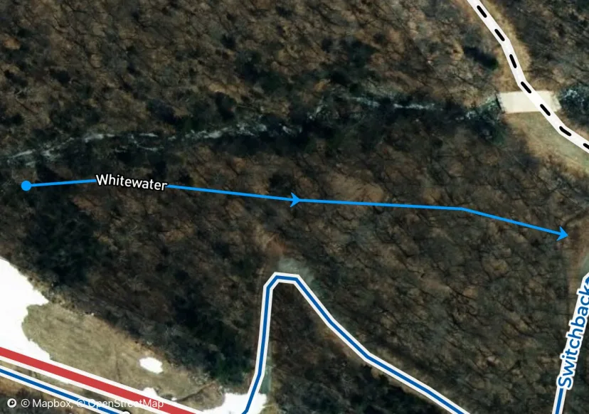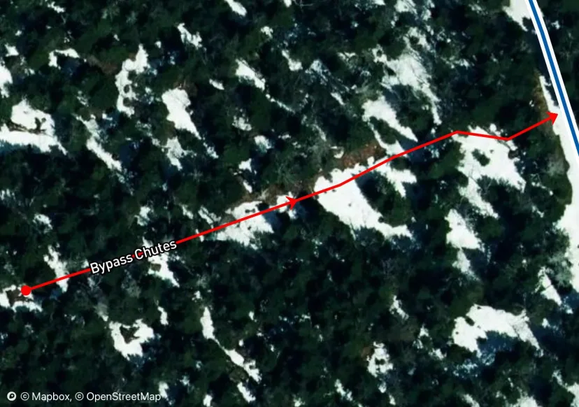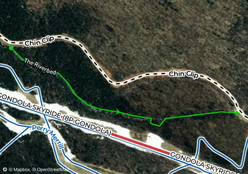 Look to skiers right of Chin Clip for an obvious entrance. A tight drop in quickly widens, almost as wide as the cut ski trails. Ski this excellent river bed, dropping a few small waterfalls. Arrive at an obvious rope line blocking off a big waterfall drop into a flat pool. Traverse right here and either drop back into the Riverbed, or ski Whitewater.
