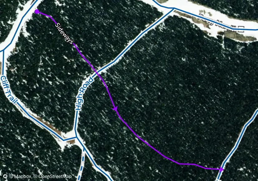 A patchwork of sorts. This borrows the bottom half of the summer hiking route Hazelton Trail, utilizing glades in the top half to get there. Follow Rimrock and look for a drop in near a small area boundary sign. Follow nicely spaced glades and drainages until you hit a creek, traverse left to where you can see the zip line. Join the Hazelton Trail for the highlight, skinning along a really skinny ridge, super unique. After the ridge, follow hardwood glades back to Perry Merril.