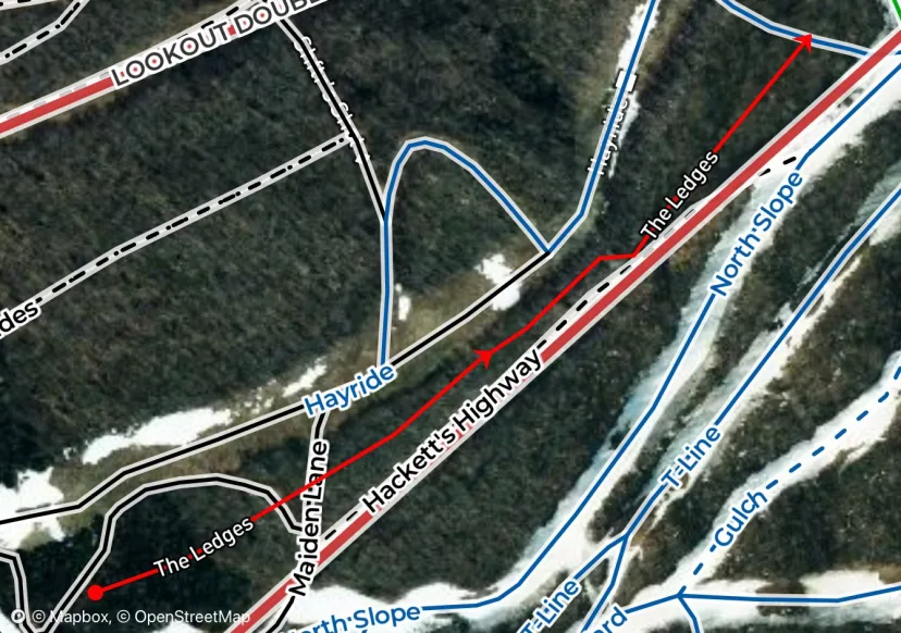 This is the narrow patch of woods to skiers left of Hackett’s Highway. You can traverse into it at any point from either side, but for the full run, drop in from the crosscut between Hayride and Lord. A tight chute leads to a steep section, cross Maiden Lane and drop into open hardwoods. Milk the glade skiing down to the drainage that crosses Hackett’s, then exit right. It’s possible to stick left of the creek here and gain access to an obviously improved glade to skiers left.