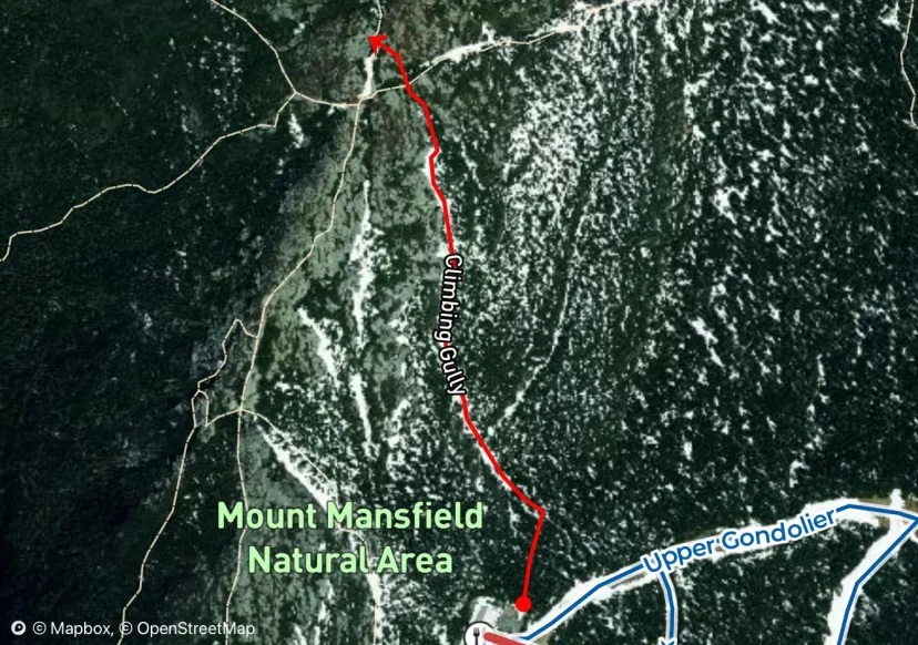Tight skiing chute skiing directly off the summit of Mount Mansfield. A Vermont classic. Drop in near a prominent boulder on the summit, ski down a low angle snowfield, this funnels into a very steep and narrow chute. Ski tight turns into a wider runout that fans out, as the name would imply. This tight section is steep and can slough you out easily on a powder day. Although small, the avalanches this terrain can produce could easily sweep you into trees below. From here you can descend straight down through another chute and ski towards Taft Lodge, or hang a hard left towards the Adams Apple to gain access to Hellbrook and other lines in that area. As with all terrain on the Chin, be aware that you are stepping outside the resort boundary into the wilderness here. There are unmarked hazards such as cliffs, avalanche terrain, and miles of unmarked forest that one can easily become lost in if they don’t know where they are going. Carry a beacon, prove, shovel, water, food, warm layers, and a first aid kit, and travel with one or more partners. Most importantly, be willing to turn around if you have doubts about conditions or finding your route. It’s better to bail than become a rescue statistic.