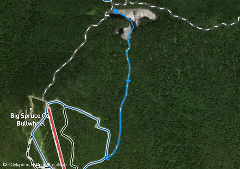 The old spruce double used to go all the way to the true summit. These days a short walk from the sensation quad is required, and the original Main Street Headwall is overgrown. With a lot of snow, this makes for fun skiing around baby trees, down to the large cliff that was blasted out by the creation of the new Main Street. Skirt this to skiers right to exit.