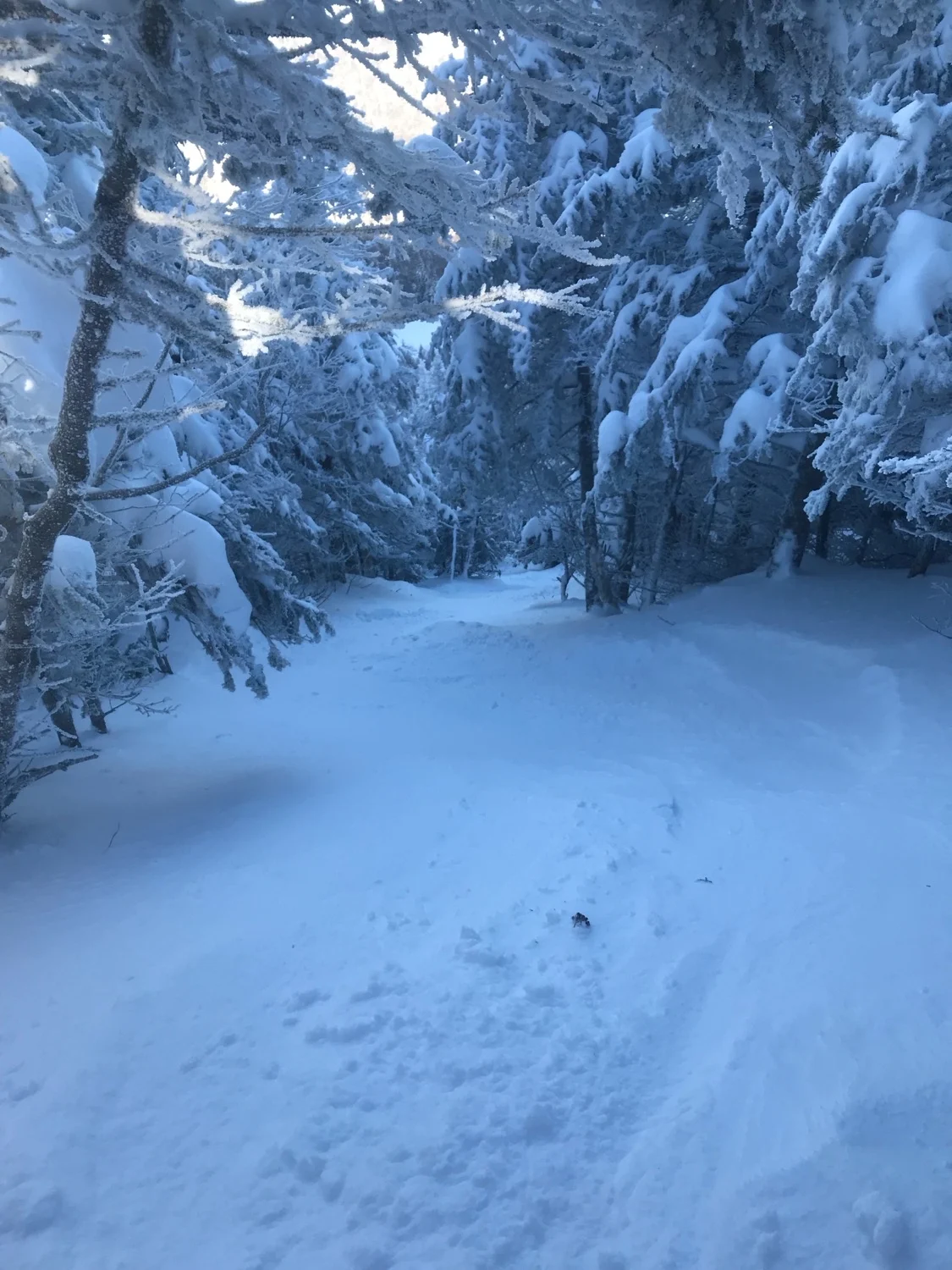 A note on history: According to Kim Brown’s 6 part article about glade skiing in Stowe, this line was originally cut by Peter Ruschp, who was tasked with cutting a narrow trail up to the Octagon, in order to run water to a spigots. It was improved in the summer of 1893 by locals named John and Skip.