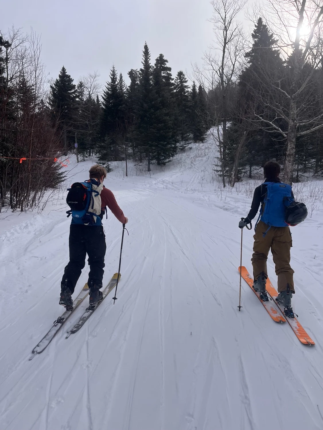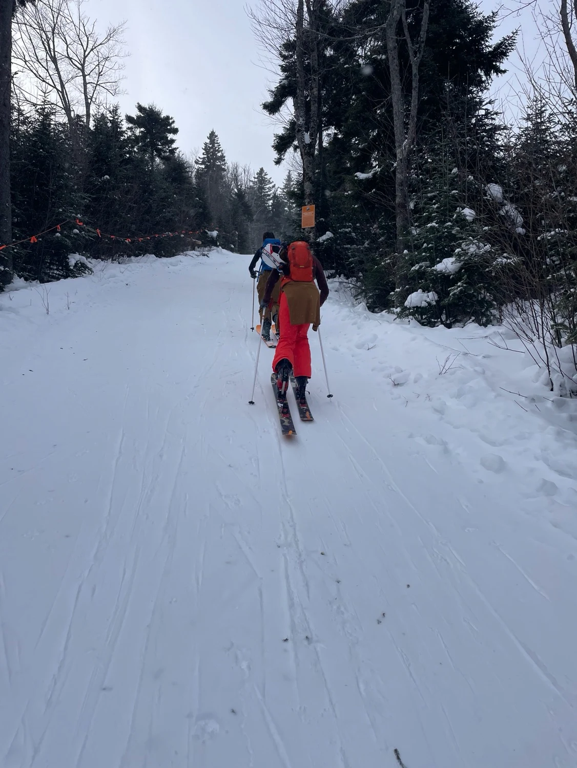 Wide open cat track to the top of the marked glades. Most skin up this way. Steep incline for the top half. Androscoggin glade will be on your right the entire time if you want to bail out. Be aware if cat skiing is open it will use this trail and you must give way to it by several feet off the trail.